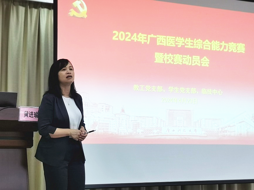 4月23日,第一临床医学院在白沙校区一楼会议室举行2024年广西医学生综合能力竞赛暨校赛动员会,分管副院长黄进瑜出席会议并讲话,会议由临技中心主办。