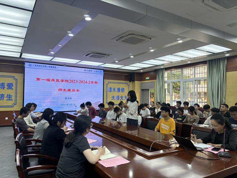 为更全面了解学生学习生活情况,倾听学生心声,进一步落实“以学生为本”的教育教学工作理念,广西科技大学第一临床医学院于5月7日下午在实验综合楼一楼会议室召开2023-2024学年第二学期期中师生座谈会。学院副院长黄进瑜出席座谈会。教学科科长袁俊、临技中心主任陈晓敏、各教研室教师代表、学工后勤等部门老师及各专业班级学生代表参加座谈会。会议由教学科科长袁俊主持。