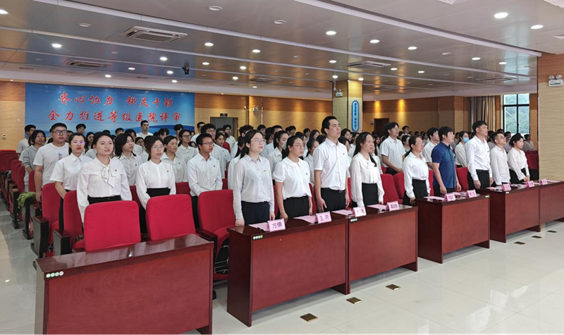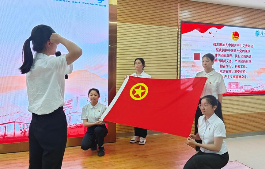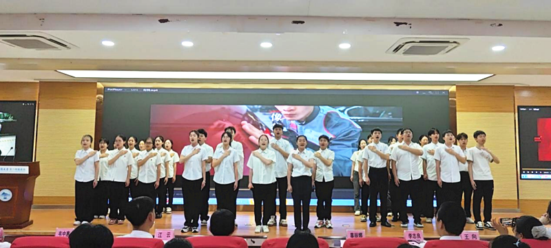 在第一临床医学院团委副书记陈佳如带领下,新、老团员在鲜艳的团旗下庄严宣誓入团誓词。随后,由团学干部带来大合唱《有我》,致敬一代代不负时代的中国青年。