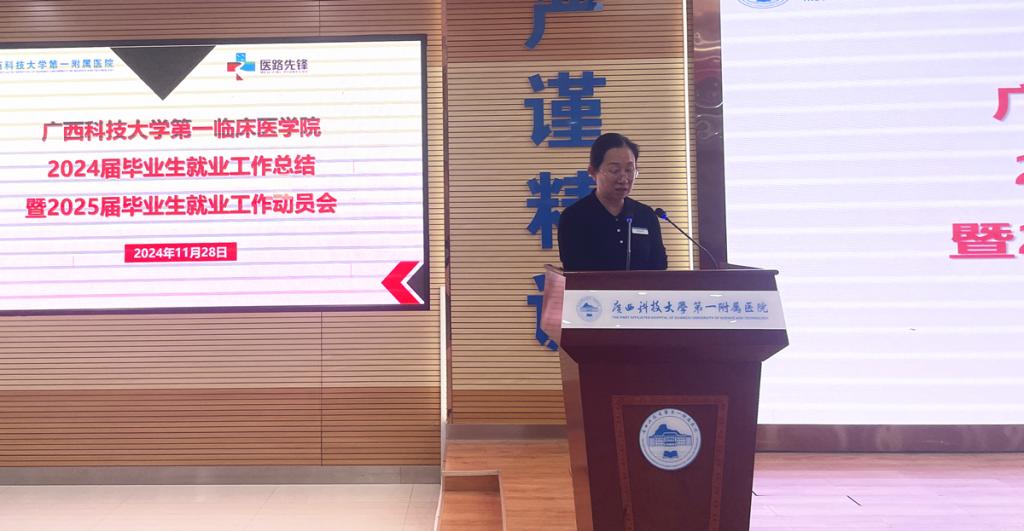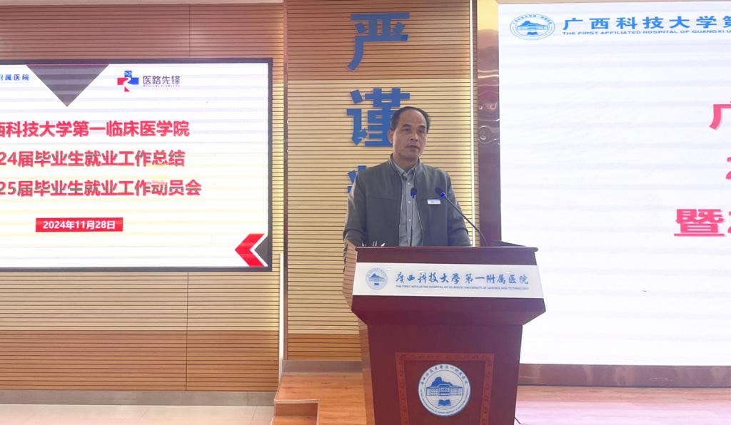 11月28日下午,广西科技大学第一临床医学院2024届毕业生就业工作总结暨2025届毕业生就业工作动员会在医院学术报告厅召开。学院党委书记庞晓红,党委副书记、院长覃天等全部领导班子成员出席会议。全体中层干部、辅导员和毕业班班主任共200人。会议由党委副书记何曲波主持。