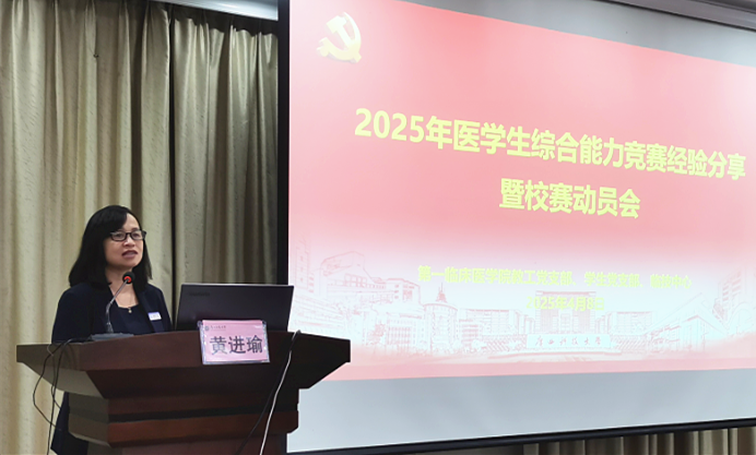 副院长黄进瑜作校赛动员。她强调,临床能力是医学生的立身之本,竞赛既是检验学习成效的试金石,更是锤炼临床思维的重要平台。她结合医院临床教学实际,从"以赛促学、以赛促教"角度对备赛工作提出指导意见,并表示学院从领导层面高度重视和支持临床技能的教学和临技中心建设,希望同学们通过临床技能竞赛增强自身的医学综合素质。