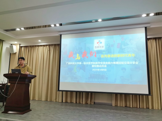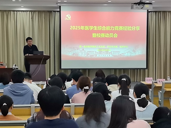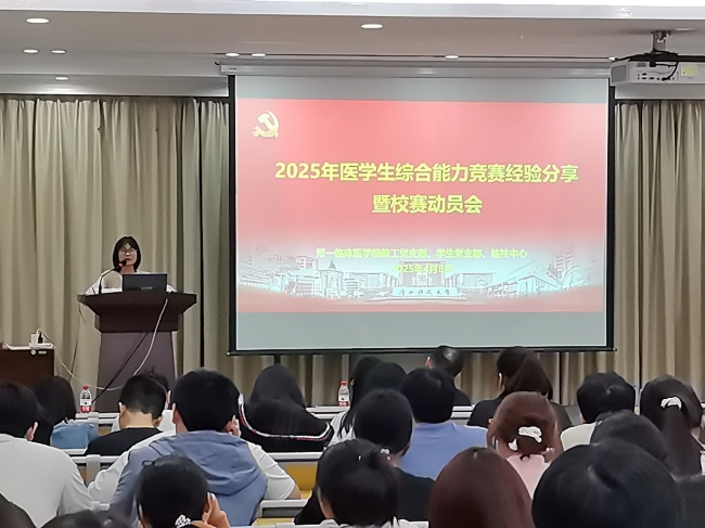 为提升医学生临床综合能力,备战临床技能竞赛,广西科技大学第一临床医学院教工党支部、学生党支部于2025年4月8日晚在白沙教学点党员活动室举办医学生综合能力竞赛经验分享暨校赛动员会。学院(医院)副院长黄进瑜出席会议。教工支部老师、2024年广西医学生综合能力竞赛参赛代表及临床专业2021级全体学生共聚一堂,共话竞赛成长之路。