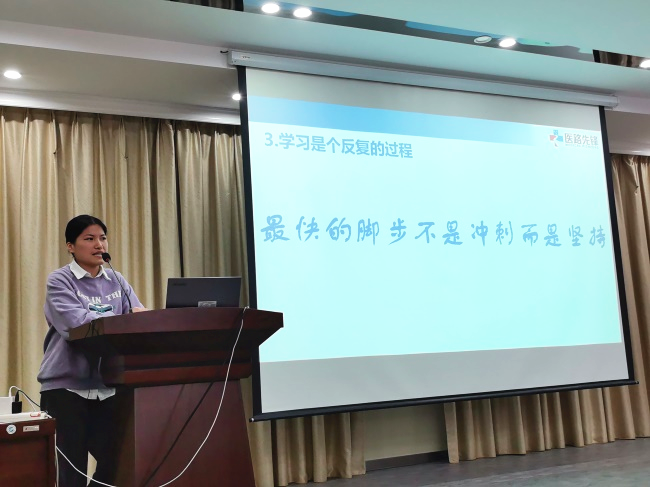 临床技能教学及培训中心主任陈晓敏,与大家分享了既往我院参加国赛、区赛的参赛选手和获得的奖项,以及2024年区赛参赛选手备赛训练历程,还解读了2025年临技校赛计划及区赛选手选拔流程。通过展示往届选手的成长轨迹,她鼓励同学们,“临床技能的锤炼是需要付出时间、精力和毅力的,但所有的付出最后定会淬火成钢,功不唐捐”。