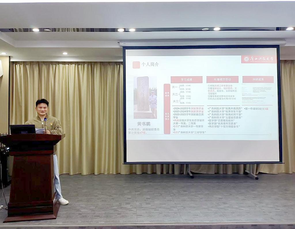 本次分享会特邀学院优秀学子黄书鹏主讲。大一至大三,他的专业及综测成绩稳居年级第一,斩获多项奖学金,累计获得47项奖项,更以第一作者身份发表3篇SCI论文;而作为中共党员、学院党建工作室副主任,黄书鹏同时兼任班级组织委员、社团社长、宿舍长。他用亮眼成绩及勤勉的学生工作态度,展现了医学生奋进向上的姿态。