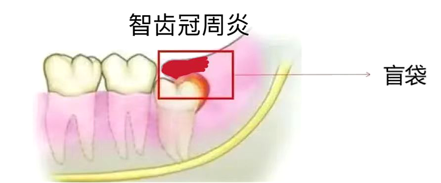 这还得从智齿特殊的位置和萌出时间说起。如上所述,智齿萌出年龄为16~25岁,此时人的颌骨发育已定型,基本不再变化,位于牙列最末端的智齿“姗姗来迟”,往往没有足够的萌出空间而呈阻生牙的状态,阻生智齿牙冠和周围牙龈之间形成一个“盲袋”,是食物残渣滞留,菌斑大量堆积的部位,容易引起炎症,称为“冠周炎”,是临床上最常见的智齿相关并发症,严重的急性冠周炎会引起颌骨骨髓炎、颌面部间隙感染合并全身并发症。