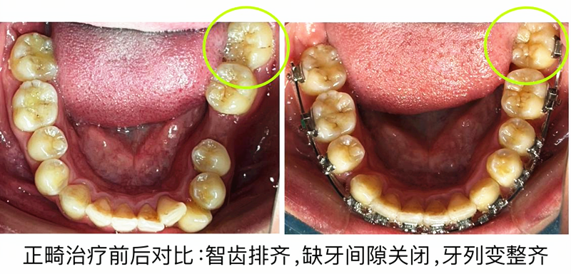 以下为口腔门诊部治疗案例展示:患者姚女士左下第一磨牙因为严重龋齿而拔除,左下智齿倾斜,但牙体无龋坏,牙周情况良好,加上患者牙齿不齐,有矫正牙齿的意愿,经过医生充分评估和沟通后开始了正畸治疗。经过正畸治疗,患者不仅左下智齿逐渐排齐,恢复正常咬合,原来磨牙缺失造成的间隙得以关闭,还收获了整齐的牙列。
