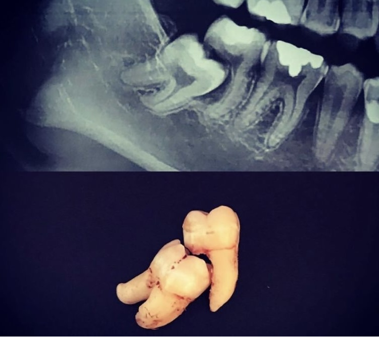 (智齿引起邻牙牙根严重吸收,最终两牙双双被拔除)
