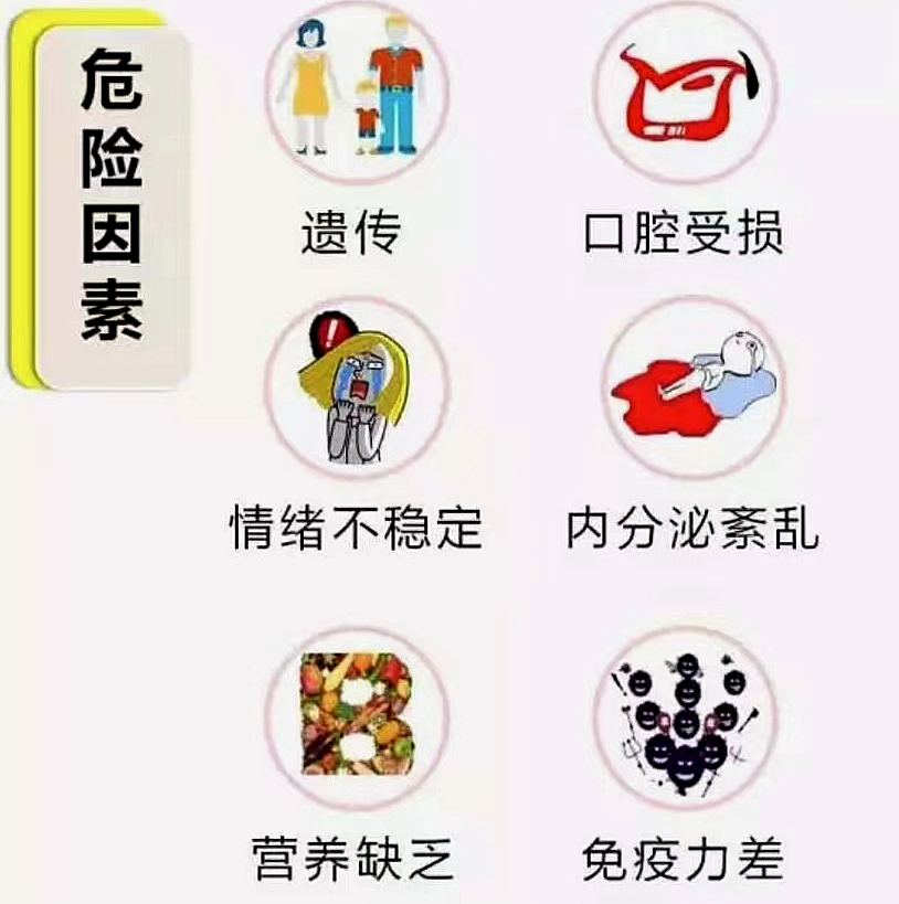引起RAU的原因有哪些呢?目前其发病机制尚未明确,是多因素共同作用的结果。但普遍认为与以下几个因素相关:如遗传因素、免疫功能失调、工作生活压力大等环境因素、精神因素、消化系统疾病或饮食因素(如进食辛辣、烫、硬食物带来的物理性刺激、缺乏叶酸、维生素B12等营养元素)等。