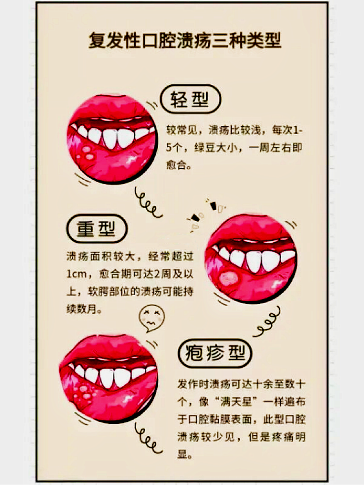 口腔溃疡有时并不只是口腔局部疾病,很多系统性疾病也会有口腔溃疡的症状,Behcet’s综合征、结核分支杆菌感染、疱疹病毒感染也可以出现口腔溃疡的症状。如果口腔溃疡反复发作尤其是伴有全身其他部位症状时,也建议及时就医。