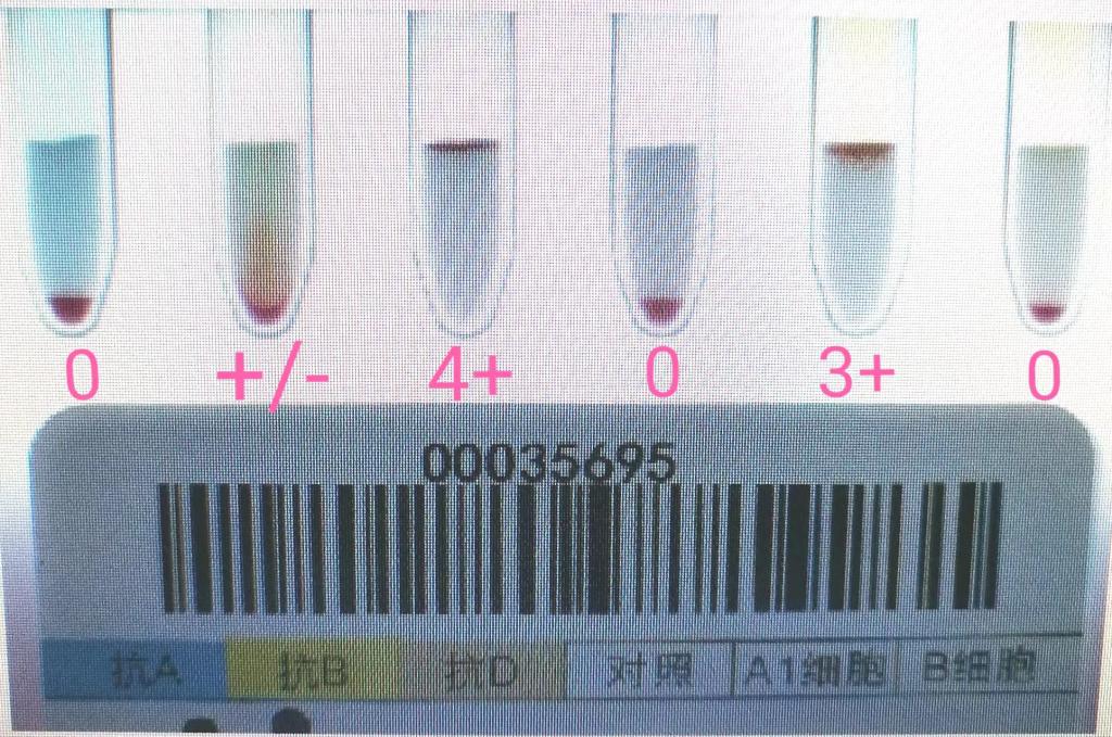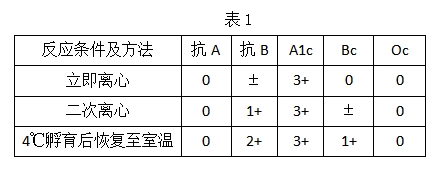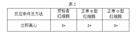 接下来就需要用试管法进行复查。结果见表1,正定型抗B侧凝集强度仍小于3+ ,而从反定型可看出患者血清中含有不规则的抗-B抗体。