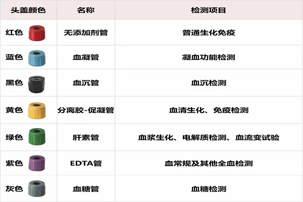 常用采血管一般有以下颜色:蓝色、黑色、红色、黄色、橙黄色、绿色、紫色和灰色。如果有特殊项目,采血管不限于这些。每一种颜色的管子里所含添加剂不一,用途也不尽相同,最终目的是确保结果的准确性。