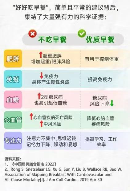 早餐提供全天能量的25%—30%,一份搭配合理、种类丰富、能量充足的营养早餐,可以让我们充满活力,有利于儿童青少年和成年人保持高效的学习工作效率。还可以降低一些疾病的发生风险,促进身心健康,提升生活质量和幸福感。