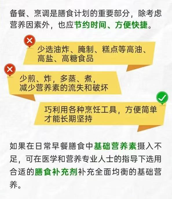 无论自己制作还是外卖,早餐要结合实际情况,调整和完善食物数量、种类,尽量做到食物多样化,多选高营养密度的食物,以及适度的营养补充,做到全面营养、合理均衡。