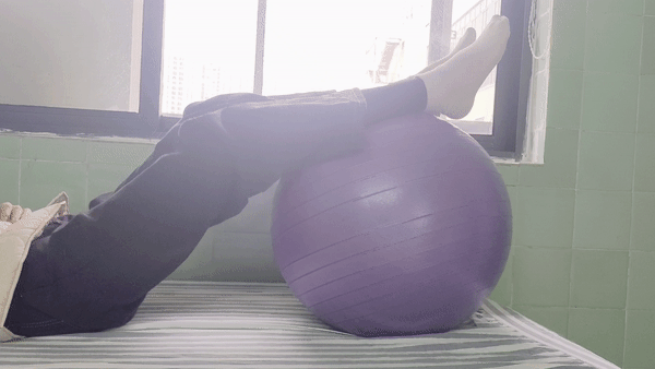 1、股四头肌控制训练,卧位踝关节下方放瑜伽球,患侧膝关节主动屈膝,健侧膝关节助力屈膝,屈膝到最大限度后保持5秒,每组20次,每天3组,每组之间可休息15秒。