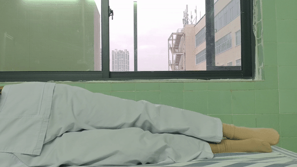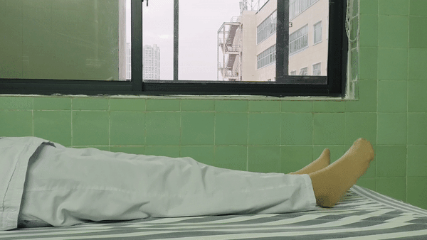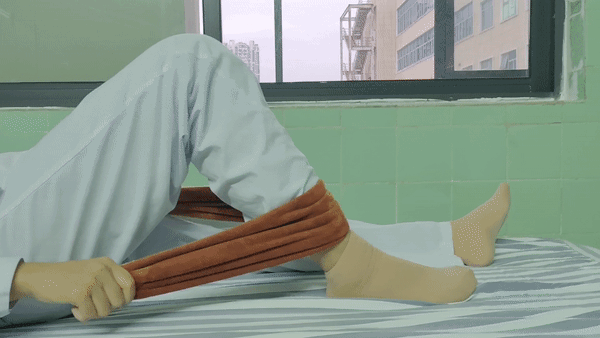 6、卧位屈膝练习,仰卧患侧膝关节稍屈曲,双手拉住小腿的毛巾辅助膝关节屈曲,在可耐受的最大角度保持5秒,然后缓慢伸直(注意:如行了半月板缝合手术,6周内主动屈膝角度不要超过90°),每组20次,每天3组。