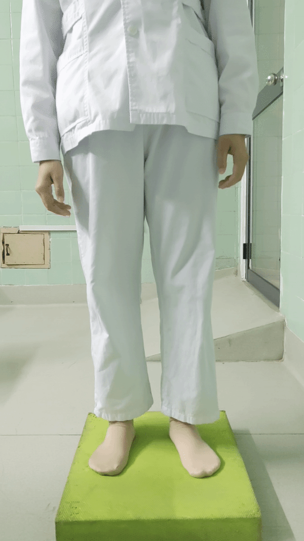 4、尝试恢复正常步态,即足跟先着地,足尖再离地的方式,尽量不要跛行。可进行重心迁移练习,提高患侧下肢平衡感,即站立时身体向患侧倾斜,使用患侧下肢负重,注意保持膝关节完全伸直,每次20秒(在肌力未完全恢复时,需戴支具做该练习)。