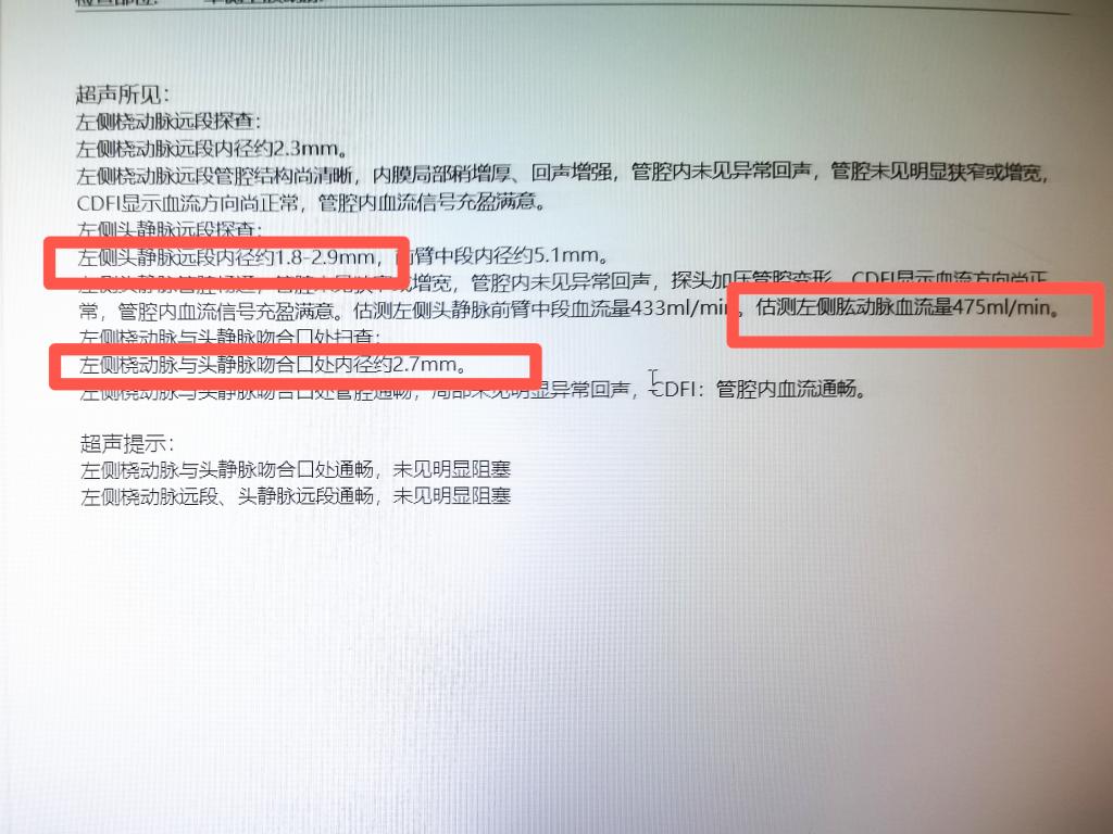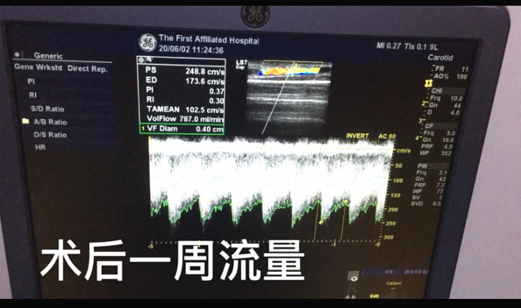 术后一周复查彩超,见血管内径明显扩张,血流量达700ml/min以上,震颤有力。后续顺利使用内瘘透析,不用再插管。
