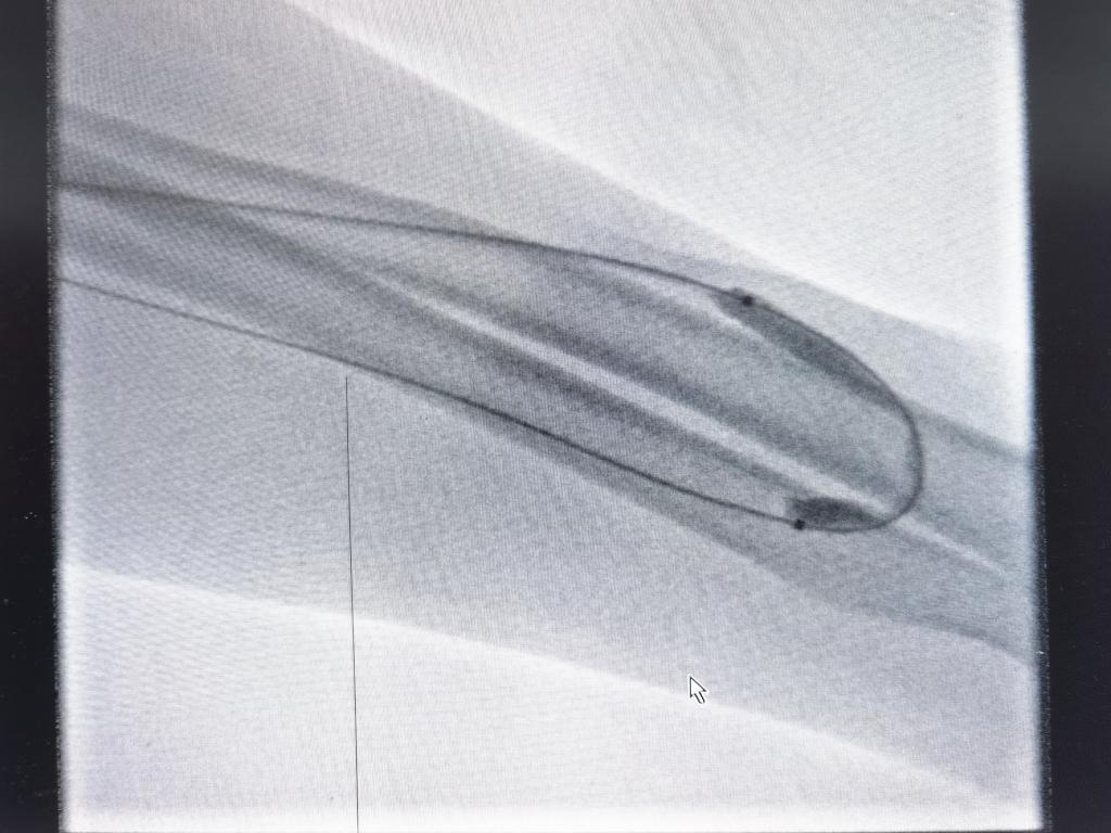 随后我们将球囊置入到狭窄位置,加压发现球囊“有腰”这是狭窄的典型表现: