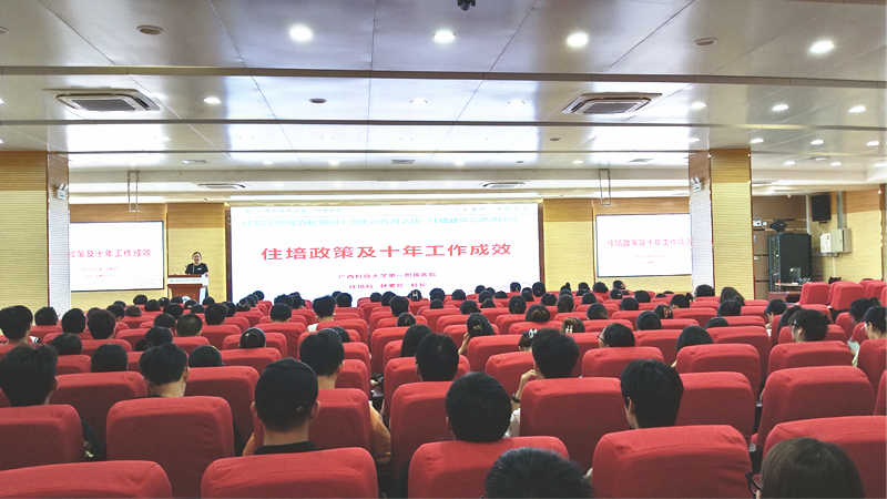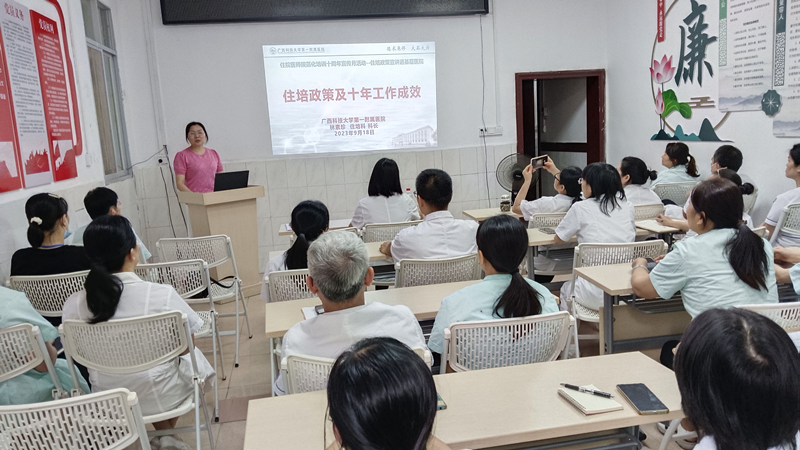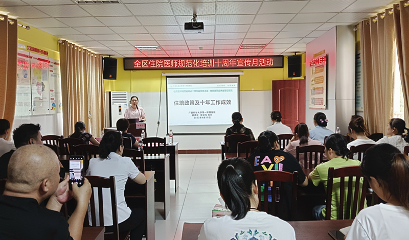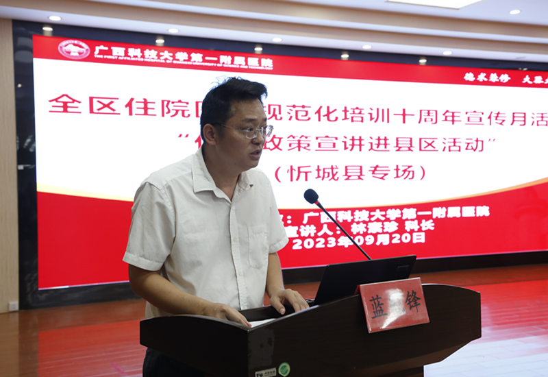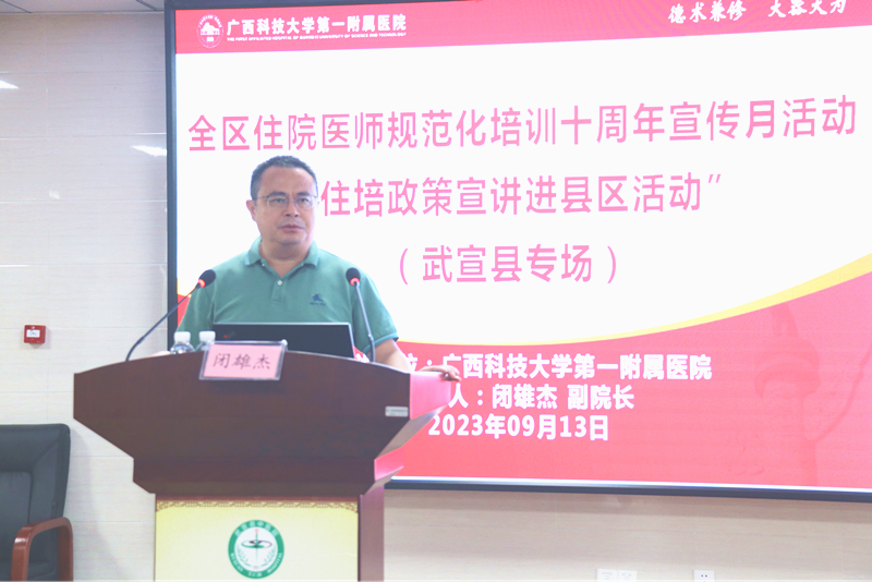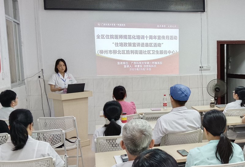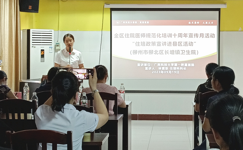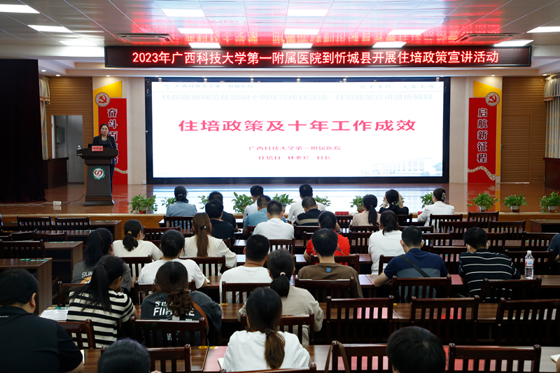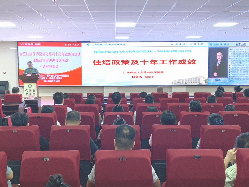 住院医师规范化培训是深化医改和医学教育改革的重大举措,是医学毕业生成长为合格临床医师的必经之路。国家住培制度实行十周年之际,根据《自治区卫生健康委办公室自治区中医药局办公室关于组织开展全区住院医师规范化培训十周年宣传月活动的通知》精神,2023年9月,广西科技大学第一附属医院陆续组织开展了五次“住培政策宣传进县区”活动。本次活动得到来宾市卫生健康委、武宣县卫生健康局、忻城县卫生健康局、武宣县中医院、忻城县人民医院、柳州市柳北区长塘镇卫生院、胜利街道社区卫生服务中心、广西科技大学第一临床医学院等单位的大力支持。辖区32家医疗机构的医院领导和负责人事、科教管理的负责人及广西科技大学本科四年级的临床医学专业学生近400人参加了宣讲会。