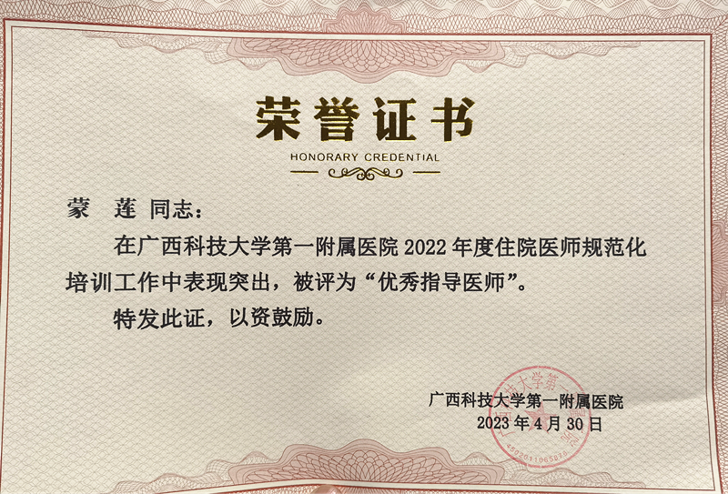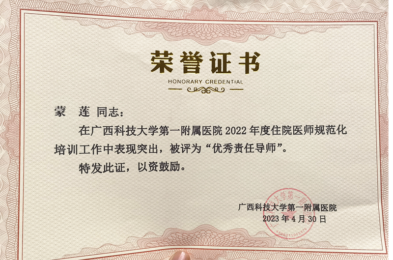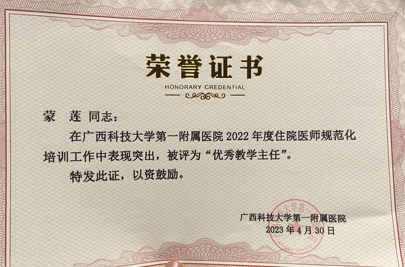 神经内科专业基地教学主任蒙莲老师,多次获得区级住院医师规范化培训“优秀指导医师”,院级“优秀教学主任”、“优秀责任导师”、“优秀指导医师”等荣誉称号。她扎根临床,全心全意为患者服务,她深耕教坛,把“救死扶伤、教书育人”作为毕生使命,将“德术兼修,大器大为”的精神融入住培管理工作,在基地主任的指导下负责基地住院医师规范化培训的日常整体工作,身体力行地推进神经内科专业基地建设。