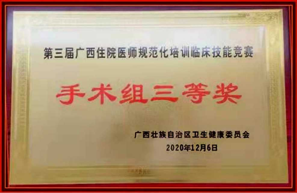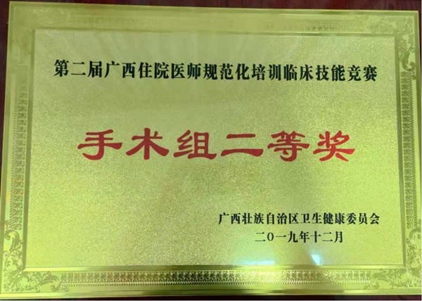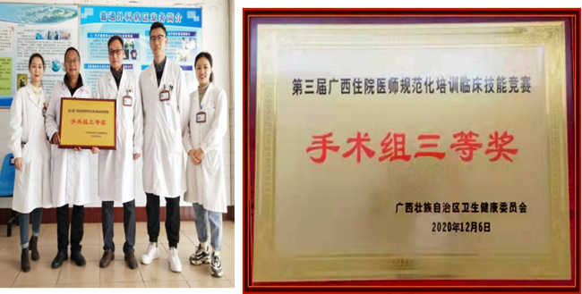 妇产科专业基地在历年的住培工作中,表现优秀,学员结业考核通过率100%。妇产科专业基地学员在参加在广西第二届、第三届住培技能竞赛中均能脱颖而出,分别获得手术组第二、第三等奖的好成绩。