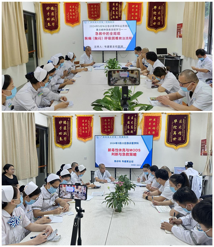 每天早上韦主任都会组织科室进行40分钟到1小时的学术交班,是同学们最期待又最害怕的时刻,因为韦主任总会提问题,还会用仅工作不到一年的护士妹妹来刺激我们住培学员,这些护士老师常年得到熏陶,自然更胜一酬,在一次又一次的交锋中把住培医师比下去了,这促使我们用功再用功,学习再学习。在交班过程中,韦主任会把各种典型病例的处置过程全面梳理,包括流程是否正确,有哪些知识点,用什么绝招,“八大生命征”、“八字方针”、“急救法则”等等是话不离口,天天都有新意,天天都是经典。通过与科室医、护老师们的交流和讨论,可以学习到新的治疗方法和理念,对于提高自己的医疗水平和技能非常有帮助。而且交班过程不仅是医学知识的交流,也是情感支持和团队建设的重要形式。在面对压力和挑战时,急诊团队成员之间的相互支持和鼓励是不可或缺的。通过交班,培养了我们的临床思维,也提高了团队的急救能力。