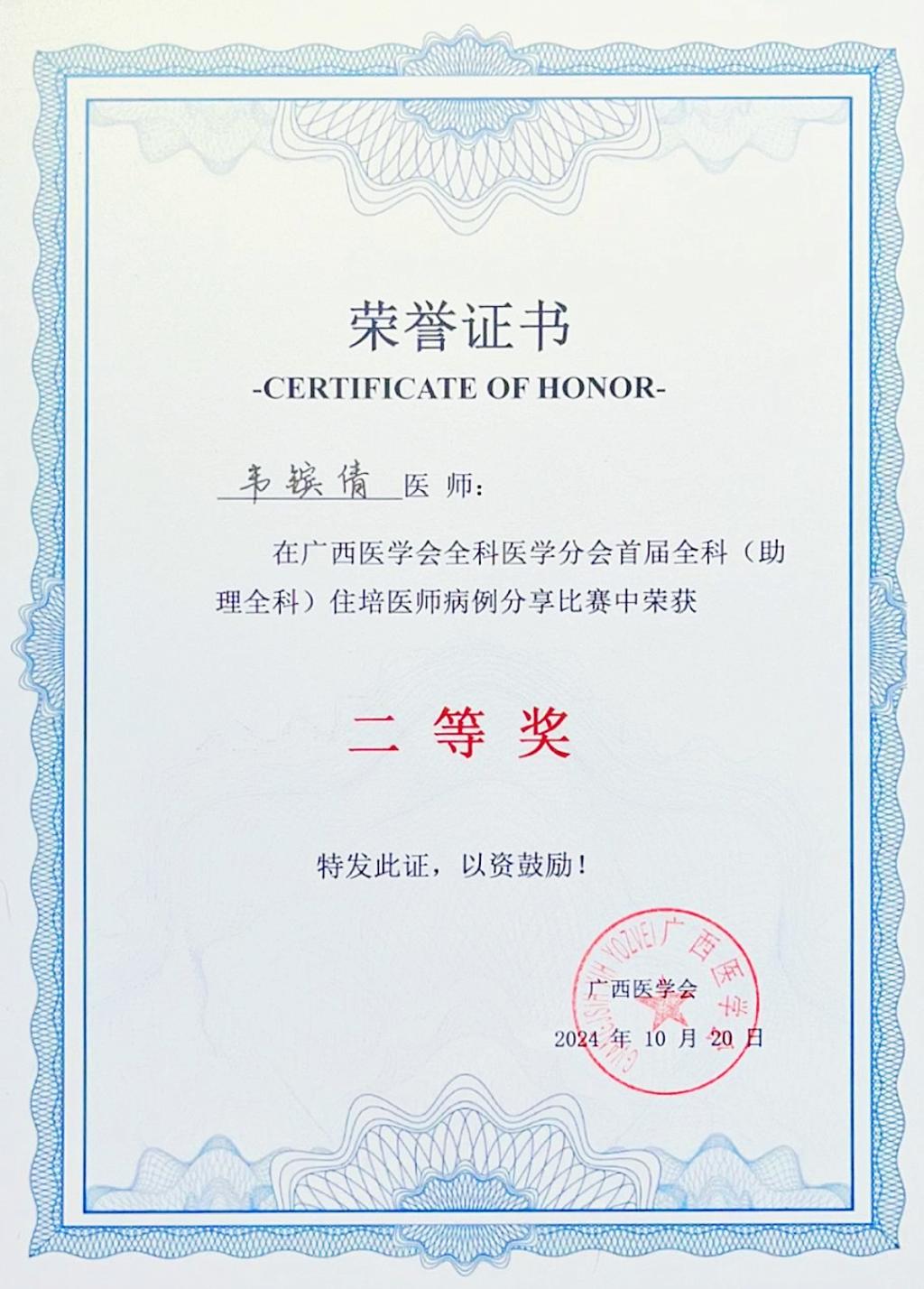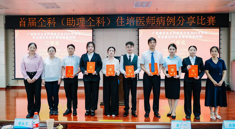 2024年10月20日,广西医学会全科医学分会在南宁举行了2024年广西首届全科(助理全科)住培医师病例分享比赛,广西科技大学第一附属医院全科专业基地2023级住培学员韦镔倩荣获二等奖!