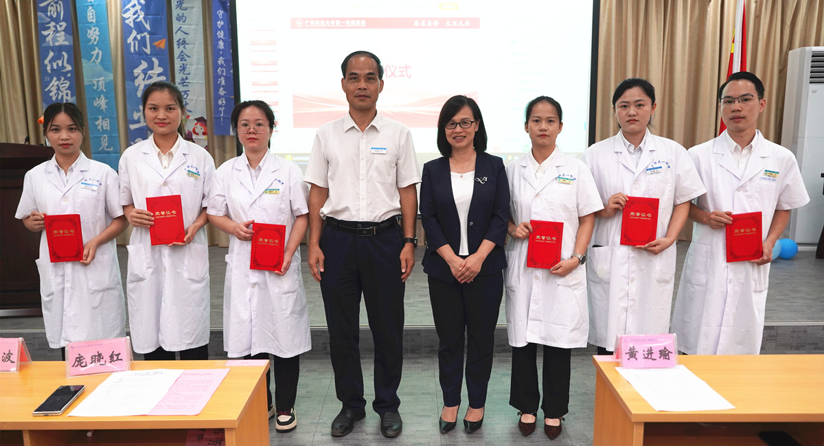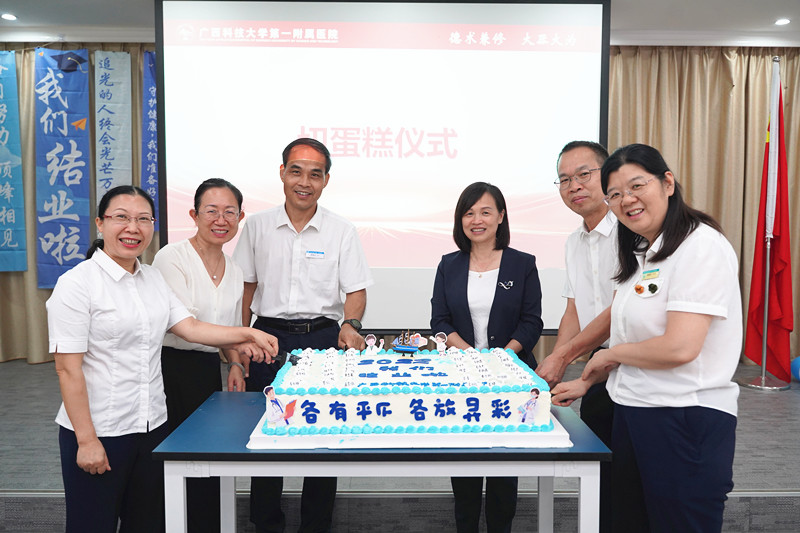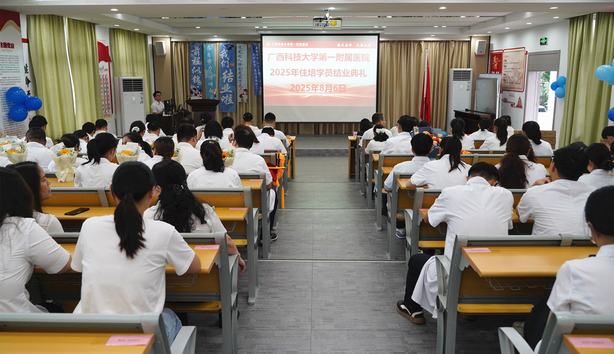 8月6日下午,广西科技大学第一附属医院在党员活动室举行2025年住培学员结业典礼。党委书记庞晓红,副院长(主持日常行政工作)黄进瑜等院领导出席典礼。专业基地教学管理人员、轮转科室指导医师代表、职能部门管理人员代表及2022级住培结业学员等一百多人参加典礼。结业典礼由黄进瑜主持。