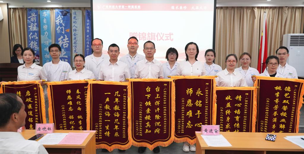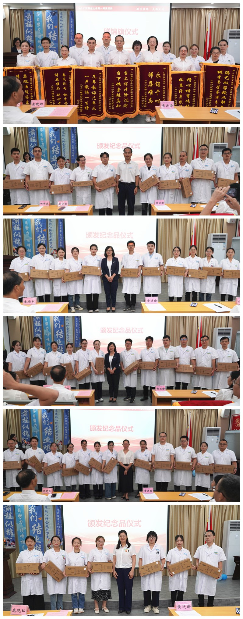 结业学员代表给培训基地及内科、外科、全科、神内、妇产科专业基地赠送锦旗。