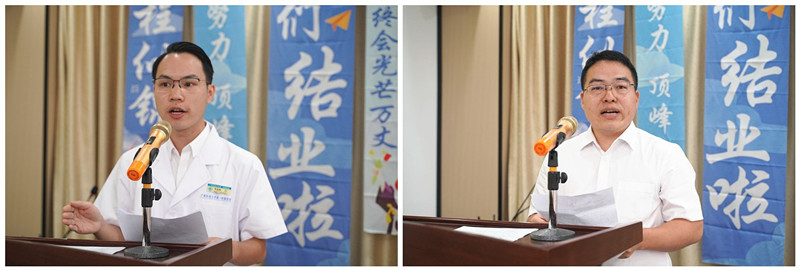 2022级神经内科住培学员韦武校作为结业学员代表发言,分享了住培期的收获与感动,表达了对医院培养和导师教诲的感恩之情。外科专业基地指导医师李国玉作为指导医师代表发言,分享三年来与学员教学相长的点点滴滴。