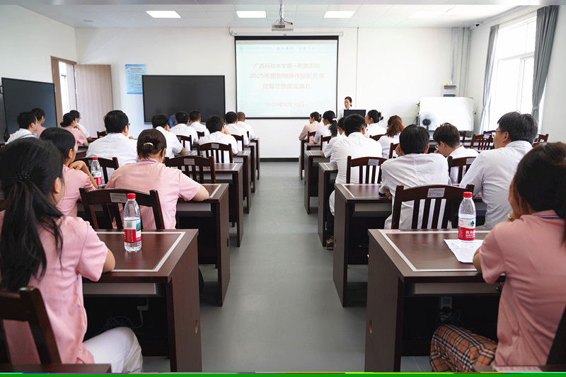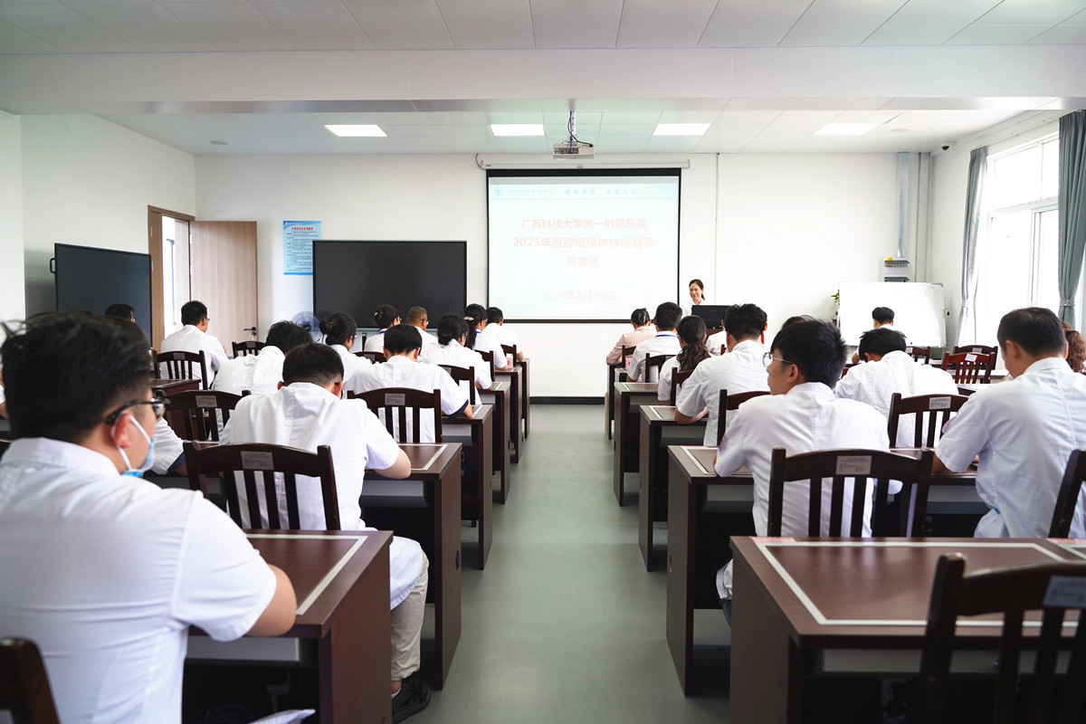 为促进腹腔镜技术的发展,提升青年医师的腔镜操作技能,增进青年医师间腔镜技术的交流,展示青年医师腔镜风采,营造微创理念学术氛围,为腔镜领域培养人才,8月30日上午,广西科技大学第一附属医院教务部临床技能培训中心联合外科、骨科、妇产科专业基地在临技中心举办2025年腹腔镜操作技能竞赛。医院党委委员、副院长陈瑞出席开幕式并讲话。评委老师、参赛选手、工作人员等参加开幕式。开幕式由临技中心主任陈晓敏主持。