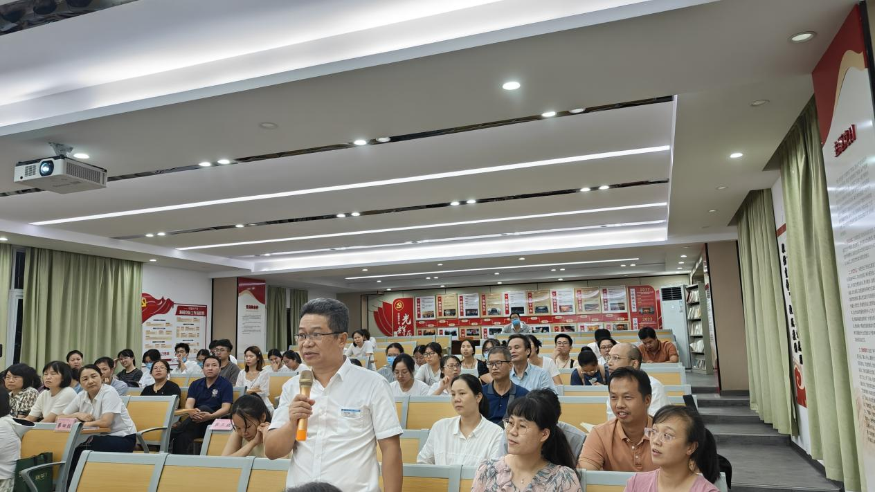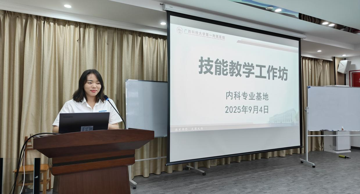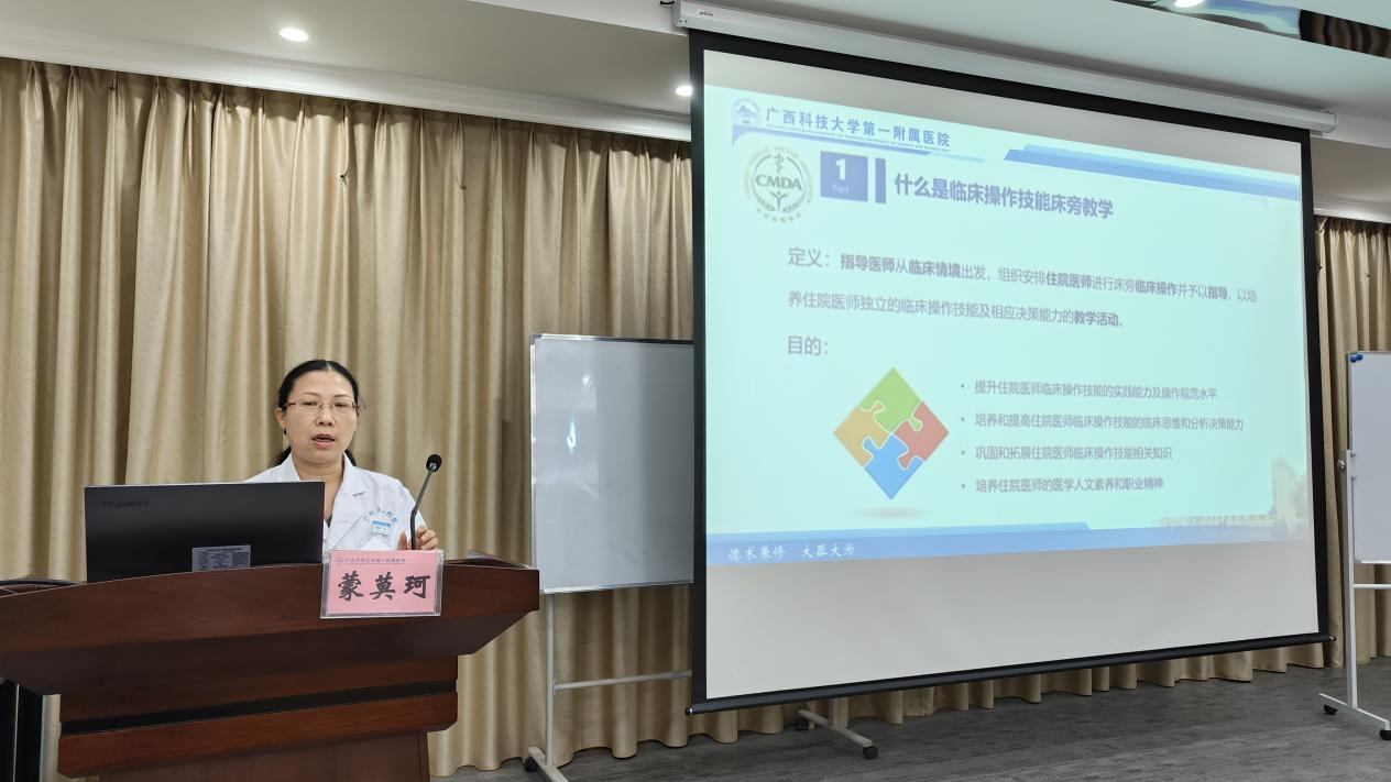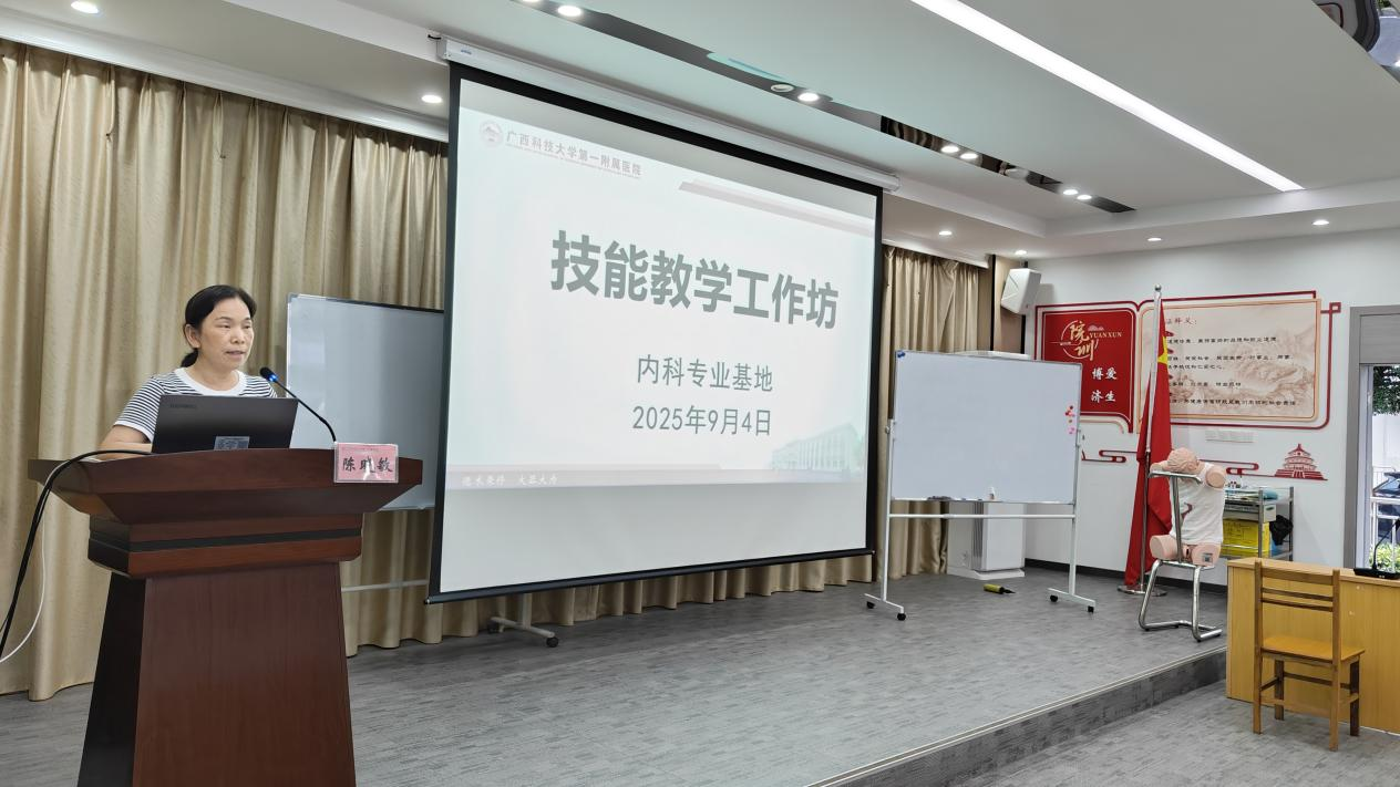 临床教学培训中心主任陈晓敏发言。工作坊由内科专业基地教学主任蒙莫珂主任医师主持,授课教师覃灏副主任医师与2023级学员李霞住院医师承担示教环节。