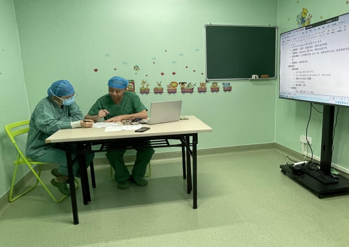 麻醉专业基地曾金主任(右一)对陈丽娜医师(左一)进行病历书写指导