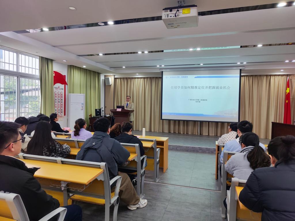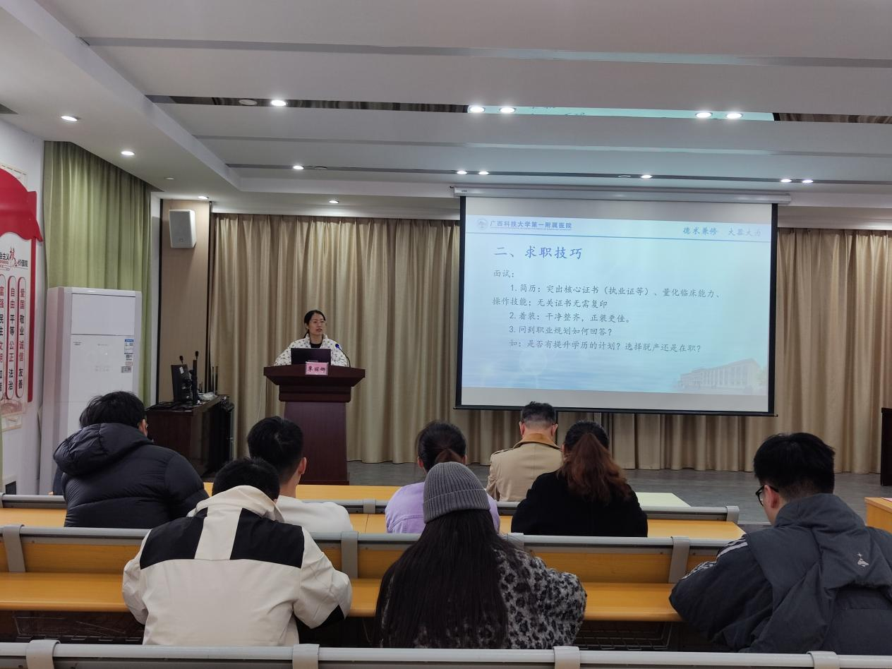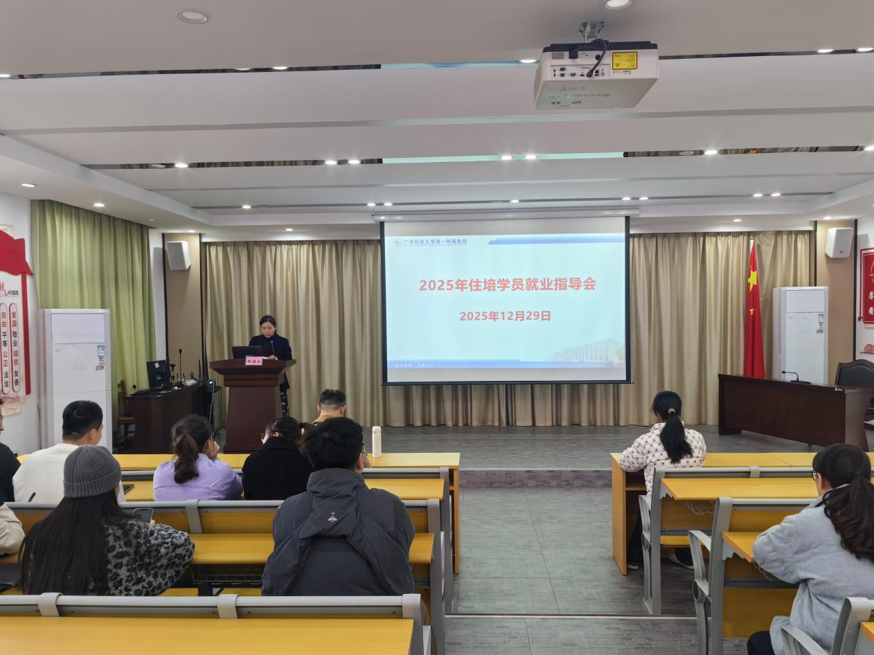 广西科技大学第一附属医院2023级住培学员明年将迎来结业,职业发展与规划进入关键阶段,为助力学员精准把握就业机遇,医院于2025年12月29日在党员活动室举办住培学员就业指导会。会议由住培科负责人陶海云主持,人事科科长覃丽娜、泛血管疾病中心首席专家、心血管内科学科带头人、全科医学科学科带头人张林潮主任医师先后作专题分享,为学员提供政策解读与职业发展指导。
