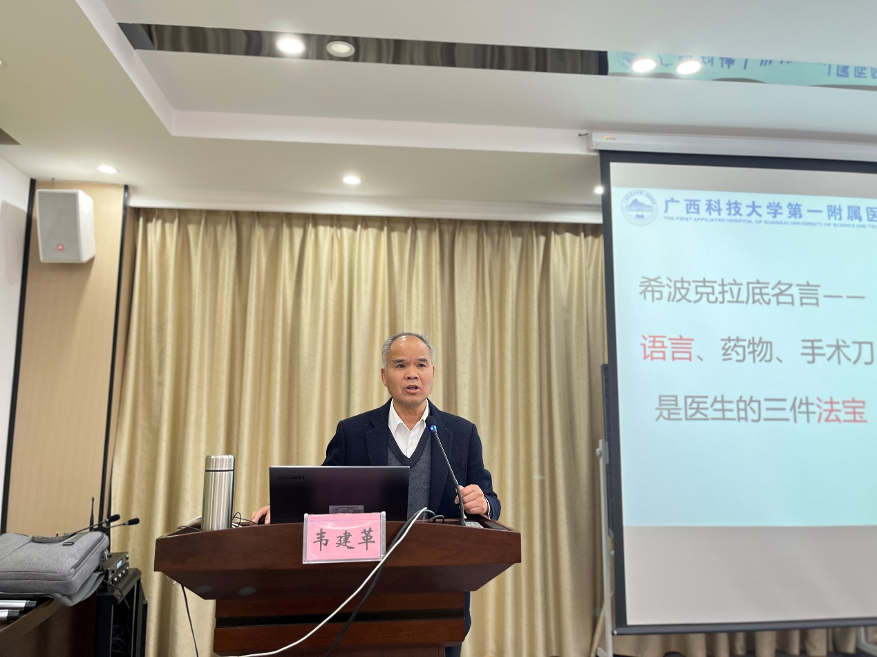 为提升住院医师规范化培训学员的临床沟通能力,构建和谐医患关系,2026年2月25日下午,广西科技大学第一附属医院在党员活动室举办了住培学员医患沟通专题讲座。讲座邀请本院急诊科首席专家韦建革主任医师授课。