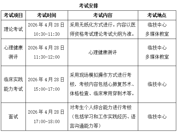 注意事项:考试携带身份证及准考证,提前20分钟签到,临床实践能力考试所用白大褂、口罩、帽子由医院提供。面试要求穿着正装,并准备2份个人简历。