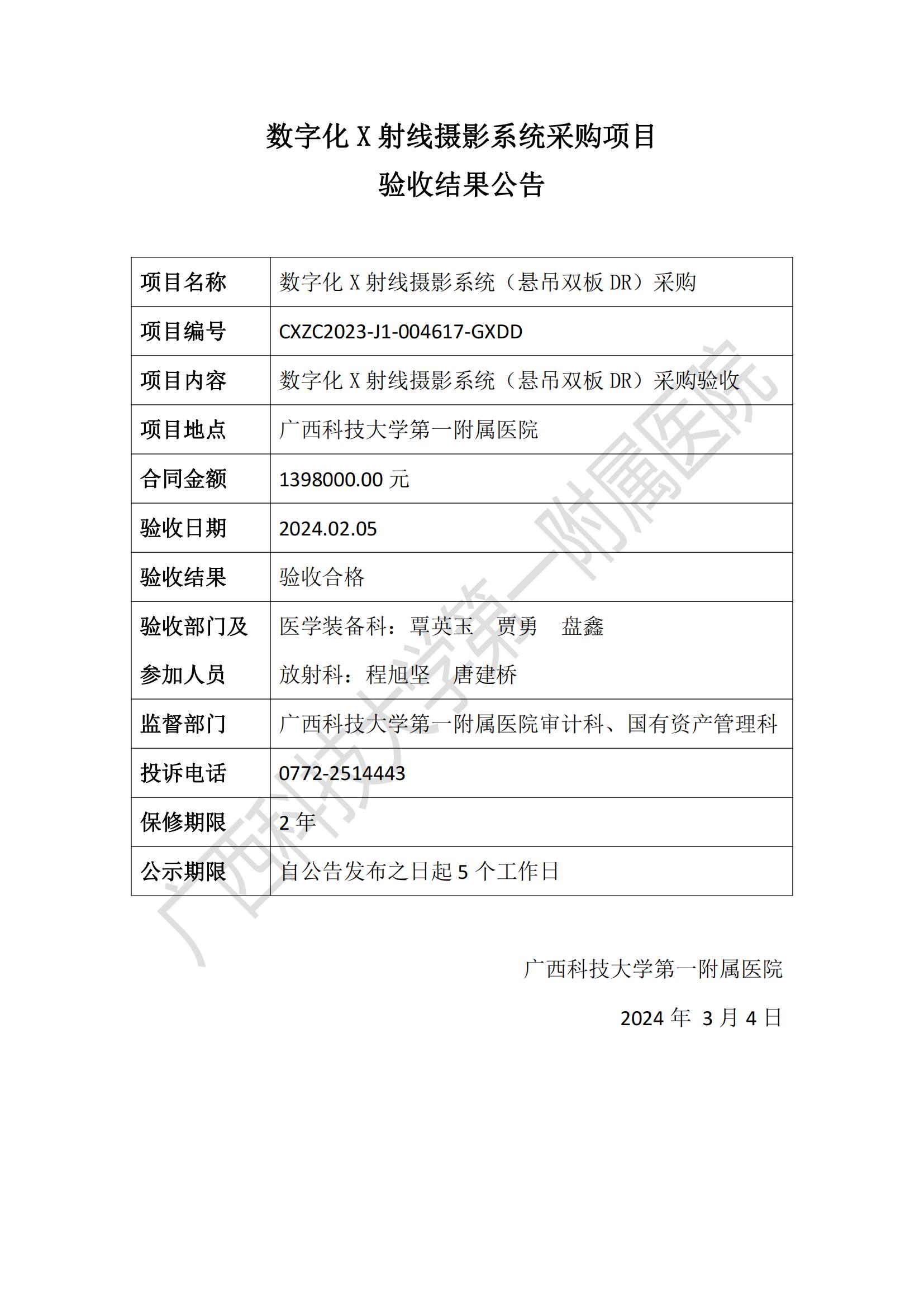 数字化X射线摄影系统采购项目验收结果公告