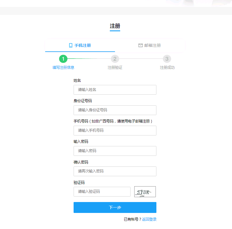 (2)注册时可选择【手机注册】或【邮箱注册】填写注册信息完成后点击【下一步】。