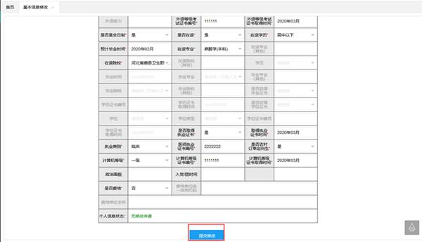 (2)考生修改完成个人信息后,点击【提交修改】即可。