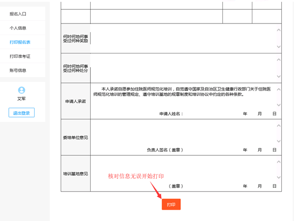 打印报名表界面