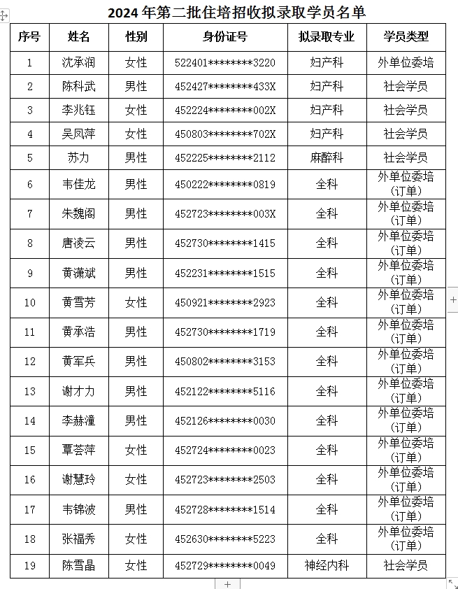 根据《自治区卫生健康委办公室关于做好2024年全区西医类别住院医师规范化培训招收工作的通知》要求,我院于2024年5月28日进行2024年第二批住培招收考核和面试,经医院院长办公会讨论决定,拟录取沈承润等19人为广西科技大学第一附属医院住培学员,名单详见附件。现对拟录取人员名单进行公示,公示期为7天,即2024年5月30日-2024年6月5日。公示期内如对公示对象有异议,请以书面形式并署真实姓名向医院住培科反映。