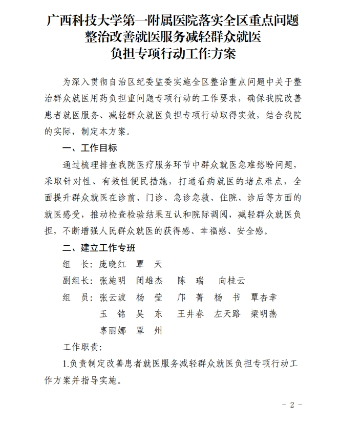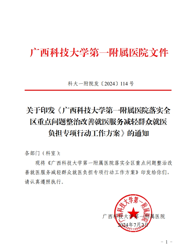 科大一附院发〔2024〕114号关于印发《广西科技大学第一附属医院落实全区重点问题整治改善就医服务减轻群众就医负担专项行动工作方案》的通知