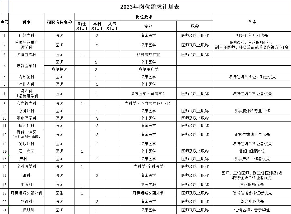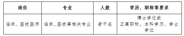 (五)应聘人员除具备以上基本条件外,还应符合招聘岗位所要求的资格条件;医院紧缺专业(麻醉、儿科、重症医学、病理、中医、心电诊断)人才可适当放宽条件。
