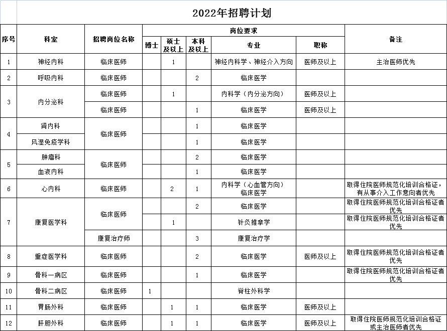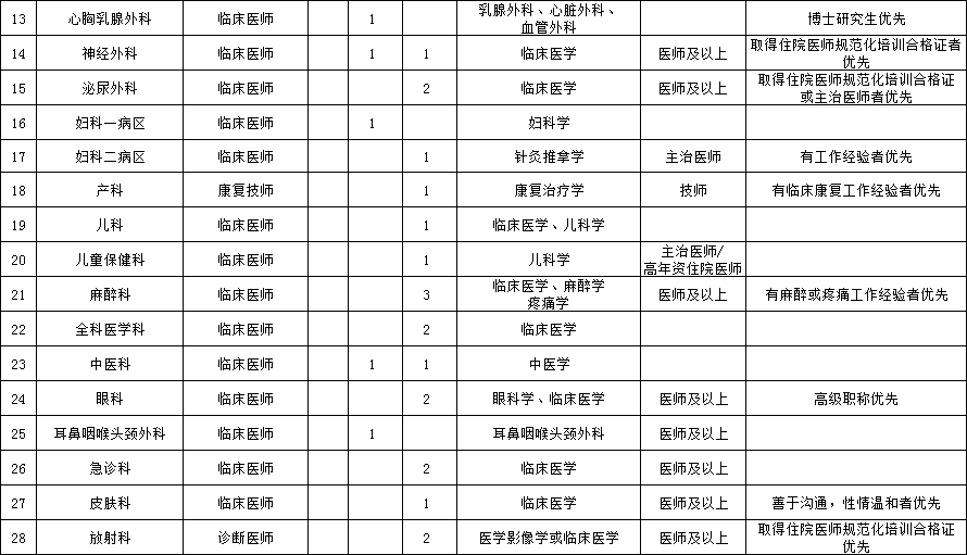 2.紧缺急需人才:麻醉科、儿科、重症医学科、急诊科、全科医学科、康复医学科、眼科、病理科、心脑电生理科等。