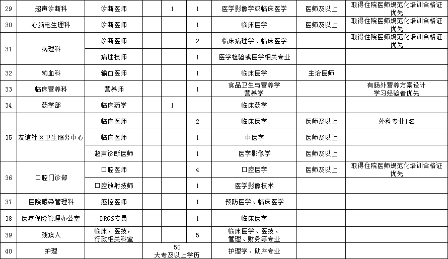 (四)年龄要求:原则上高级职称52岁及以下,中级职称40岁及以下,初级职称及以下30岁及以下。医院紧缺专业人才可适当放宽年龄要求;