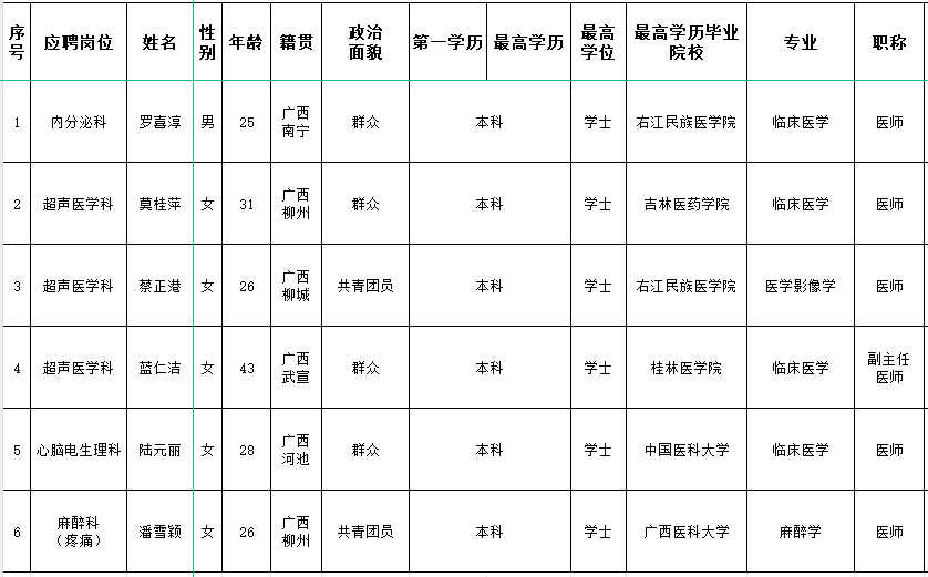 根据医院人员招聘制度,应聘我院临床医疗岗位的罗喜淳等6位同志通过医院面试、考核合格。经研究决定,同意确定罗喜淳等6位同志为拟聘用人员,现予以公示五个工作日,公示时间从2024年7月1日至2024年7月5日,对公示内容如有异议,请以书面形式,并署真实姓名和联系地址,于2024年7月5日前邮寄或直接送至人事科。地址:柳州市跃进路126号实验综合楼二楼人事科,联系电话:0772-2514419。