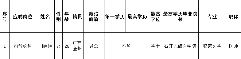根据医院人员招聘制度,应聘我院临床医疗岗位的闫婷婷同志通过医院面试、考核合格。经研究决定,同意确定闫婷婷同志为拟聘用人员,现予以公示五个工作日,公示时间从2024年7月8日至2024年7月12日,对公示内容如有异议,请以书面形式,并署真实姓名和联系地址,于2024年7月12日前邮寄或直接送至人事科。地址:柳州市跃进路126号实验综合楼二楼人事科,联系电话:0772-2514419。