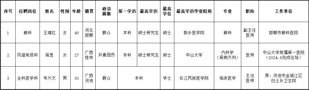 根据医院人员招聘制度,应聘我院临床医疗岗位的王瑞红等3位同志通过医院面试、考核合格。经研究决定,同意确定王瑞红等3位同志为拟聘用人员,现予以公示五个工作日,公示时间从2024年8月1日至2024年8月7日,对公示内容如有异议,请以书面形式,并署真实姓名和联系地址,于2024年8月7日前邮寄或直接送至人事科。地址:柳州市跃进路126号实验综合楼二楼人事科,联系电话:0772-2514419。