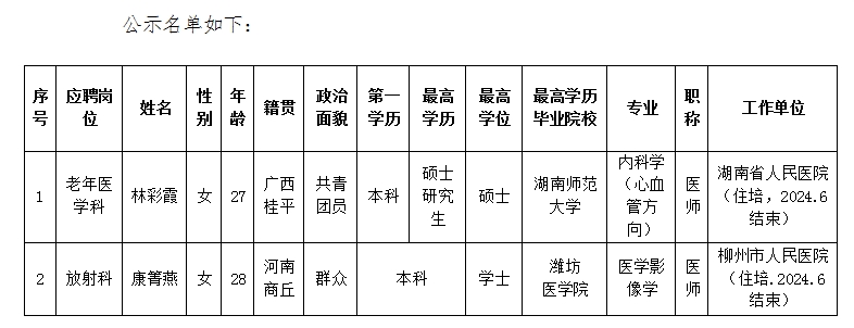 根据医院人员招聘制度,应聘我院临床医疗岗位的林彩霞、康箐燕二位同志通过医院面试、考核合格。经研究决定,同意确定林彩霞、康箐燕二位同志为拟聘用人员,现予以公示五个工作日,公示时间从2024年9月5日至2024年9月11日,对公示内容如有异议,请以书面形式,并署真实姓名和联系地址,于2024年9月11日前投至公示栏旁意见箱;邮寄、直接送至人事科。地址:柳州市跃进路126号实验综合楼二楼人事科,联系电话:0772-2514419。