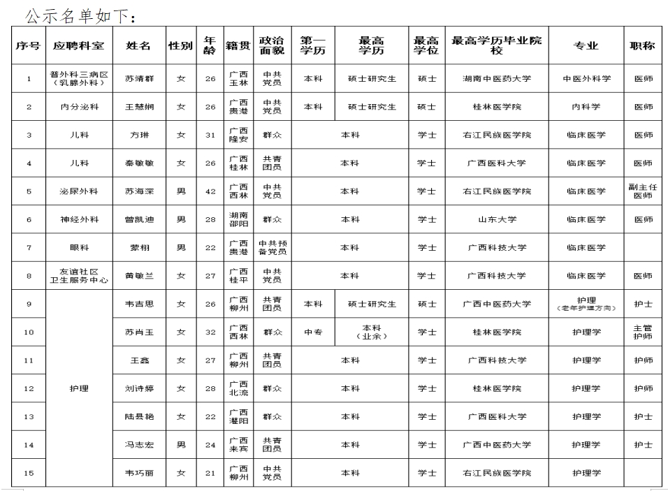 根据医院人员招聘制度,应聘我院临床医疗、护理岗位的苏靖群等15位同志通过医院面试、考核合格。经研究决定,同意确定苏靖群等15位同志为拟聘用人员,现予以公示五个工作日,公示时间从2025年1月26日至2025年2月7日。对公示内容如有异议,请以书面形式,并署真实姓名和联系地址,于2025年2月7日前投至公示栏旁意见箱,邮寄、直接送至人事科。地址:柳州市跃进路126号实验综合楼二楼人事科,联系电话:0772-2514419。